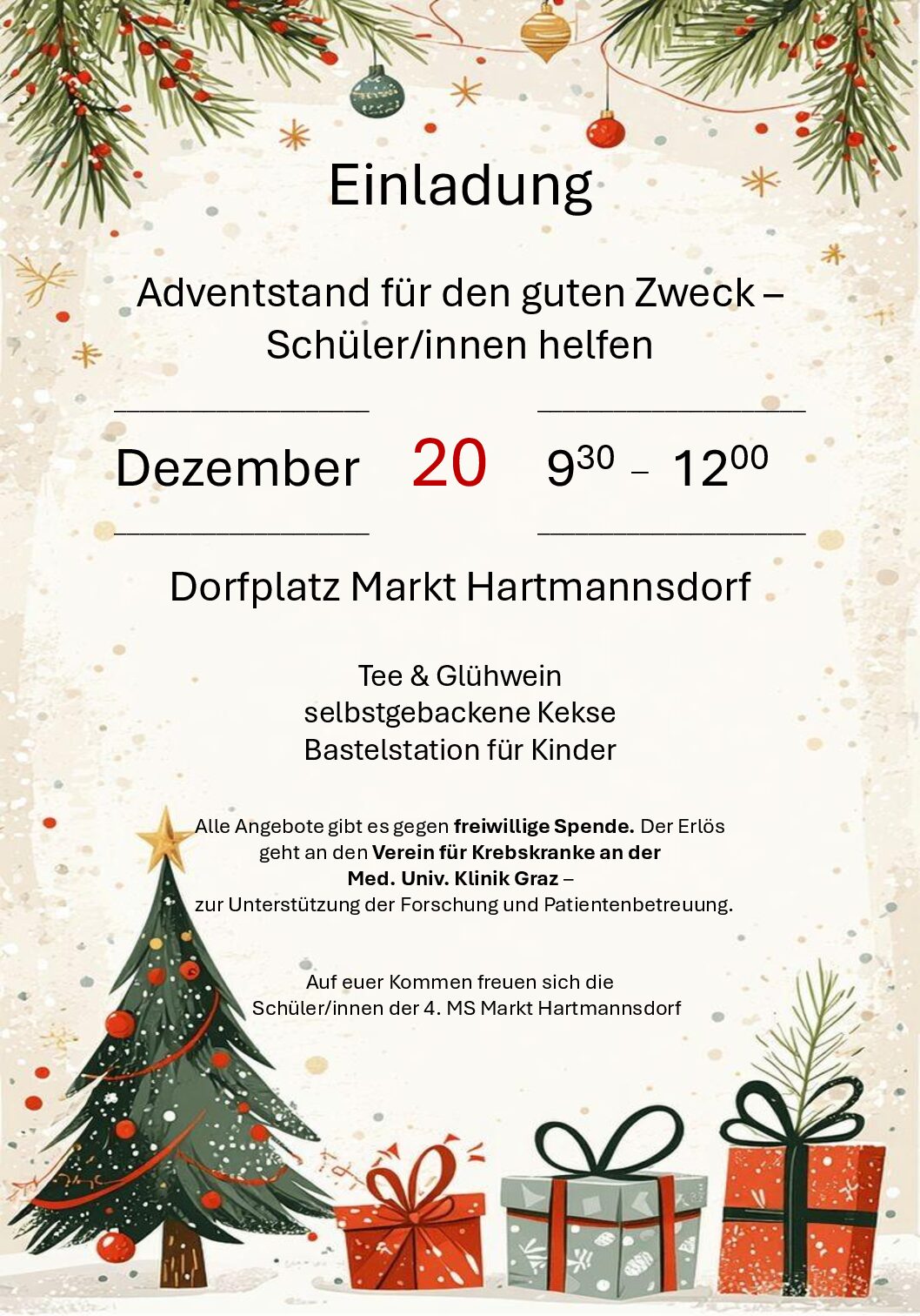 Am Samstag, dem 20. Dezember 2025, organisierten die Schüler:innen der 4. MS Markt Hartmannsdorf von 9.30 bis 12.00 Uhr einen stimmungsvollen Adventstand am Dorfplatz. Bei winterlichem Wetter wurden Tee, Glühwein und frisches Germgebäck gegen eine freiwillige Spende angeboten. Zusätzlich konnten Besucher:innen liebevoll zusammengestellte Mehlspeisenboxen erwerben, deren Inhalt von Eltern und Schüler:innen selbst gebacken wurde.